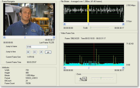 WMSnoop is a tool for analyzing Microsoft® Windows Media 9 Series Video files on a frame by frame basis. This tool is used by advanced streaming professionals to optimize encoding and production techniques. WMSnoop provides analysis graphs of frame size and averaged file bitrates enabling power users to tweak their encoding pipeline to deliver optimal results.