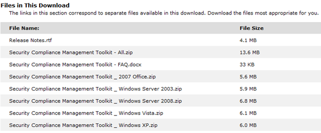 The Security Compliance Management Toolkit series builds on previous Solution Accelerators to provide you with expanded best practices and additional automation tools to help configure and deploy security settings for the following operating systems and applications: Windows Server 2008, Windows Server 2003 Service Pack 2 (SP2), Windows Vista SP1, Windows XP Professional SP3, and 2007 Microsoft Office SP1.