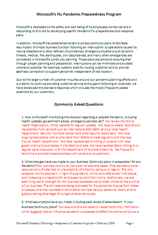 In response to customer inquiries to what our response is to a potential disaster such as a pandemic flu, Microsoft has a prepared explanation as to what our procedures are for addressing such a situation.
