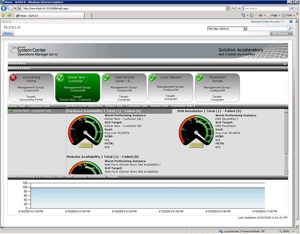 Using the information collected by Operations Manager 2007 R2, and leveraging the service level objectives that you can set against IT services and their components, this graphical dashboard presents detailed information through Microsoft SharePoint that helps customers: