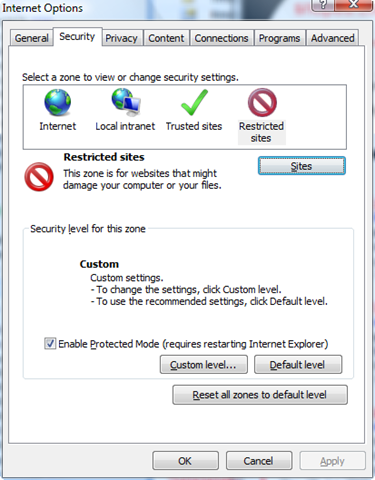 - Click the Security Tab. You should see a set of Zone icons, including one called “Restricted Sites”.