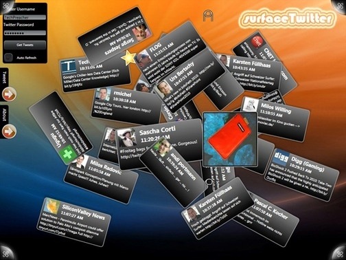 - Show the 25 most recent Tweets in a “ScatterView” control, making each Tweet a movable and resizable object on the Surface.