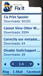 We have a little known Windows 7/Vista Gadget known as the “Fix It” gadget that list out the most popular “Fix It” routines that we’ve published on the Microsoft Support web site. “Fix It” routines are pieces of executable code that you can run from our Support web site that automatically repair or configure your computer simply by downloading them.