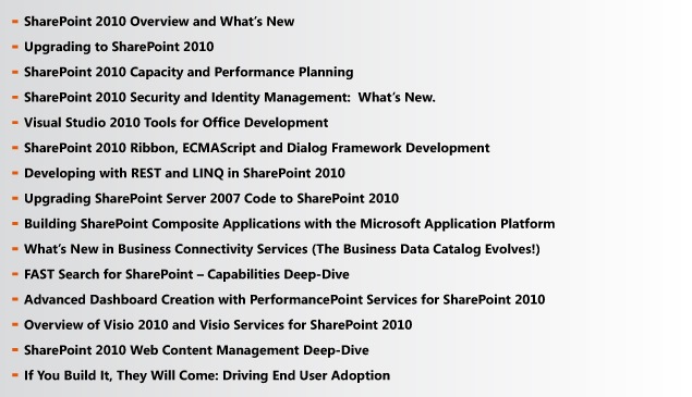 We have almost 250 sessions planned, and over 80% of them will be brand new 2010 content. That’s 15,000 minutes of SharePoint, SharePoint and more SharePoint that you’re simply not going to get anywhere else!