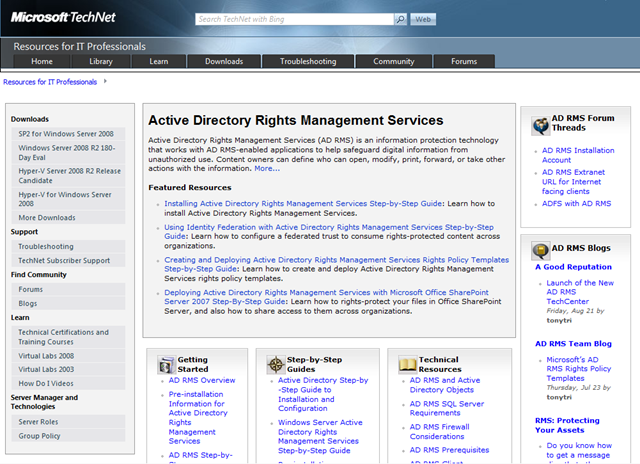 If you’ve been keeping your thumb on the pulse of Rights Management Services, which by the way is one of my two FAVORITE pet products here at Microsoft, (The other being Windows Media) you know that Rights Management’s resources have been sort of scattered all over the place.