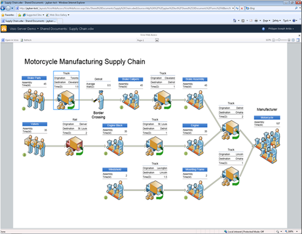 Visio Services enables you to navigate diagrams using easy to use and familiar metaphors for panning, zooming, switching pages, following hyperlinks and discovering shape data. You can also open any Visio Web Drawing in Visio using the “Open in Visio” button. Note that the person viewing the diagram can do so: