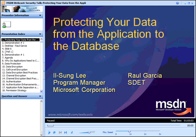 MSDN Webcast: Security Talk: Protecting Your Data from the Application to the Database (Level 300)