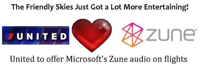 “United is committed to providing our customers with innovative onboard entertainment options, and we look forward to working with Zune and Microsoft to create new onboard experiences,” said Tom O’Toole, United’s senior vice president and chief marketing officer.