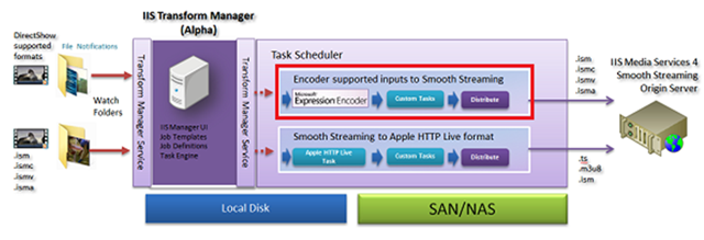 Whether you have libraries of content or a steady stream of user-generated content that you want to convert from one video format to another, IIS Transform Manager can help. Transform Manager, part of the upcoming IIS Media Services 4.0, provides simple integrated video encoding and batch conversion of video files to the IIS Smooth Streaming format and the MPEG-2 Transport Stream adaptive streaming format supported by Apple devices.