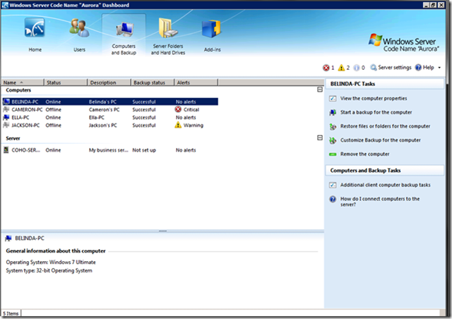 - Network Monitoring and Protection: Windows Small Business Server Code Name “Aurora” monitors its own health status and the status of client computers running Windows XP, Windows Vista®, Windows 7, and Mac OS X version 10.5 and above. Health status notifies you of issues or problems related to computer backups, server storage, low disk space, and more.