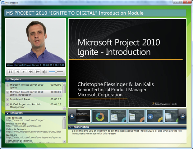Each module is conveniently delivered using a Silverlight player that gives you the ability to view the presenter and the slides as the same time as well as give you a chapter breakdown and full transcription of presentation. Please note that the primary goal of the Ignite content was to enable technical readiness prior to launch, focusing specifically on what’s new with respect to EPM 2007, hence we highly encourage you invest in training for a successful implementation of this exciting release of Microsoft Project 2010.