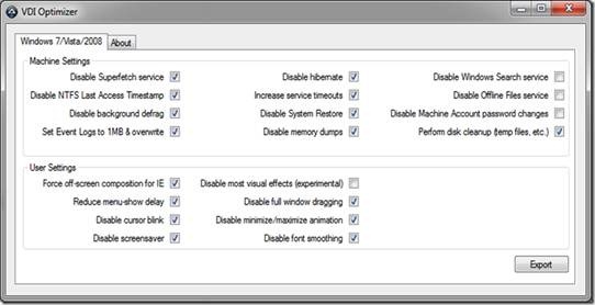 You can make machine based selections for turning off services and functions that may not be required when the operating system is running in a VDI environment such as hibernation, system restore, and background defrag, as well as adjusting some user based settings such as visual effects, font smoothing and off-screen composition for Internet Explorer.