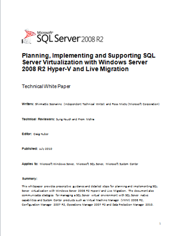 This white paper provides prescriptive guidance and detailed steps for planning and implementing SQL Server virtualization with Windows Server 2008 R2 Hyper-V and Live Migration.