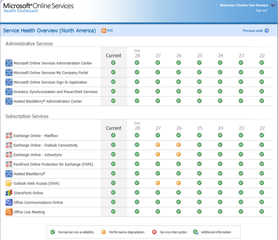 Today, we’re taking a step forward in delivering more timely, accurate and targeted information about BPOS service status by introducing the Microsoft Online Service Health Dashboard. It is designed to provide a greater level of information regarding the status of all services and tools, and it includes information about current service status as well a 35-day status history.