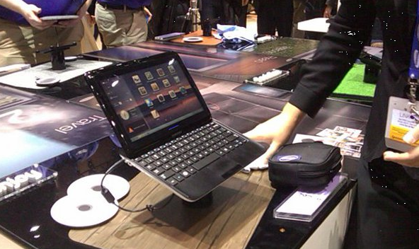 - Samsung Sliding PC 7 series. Convertible Tablet with display that "slides up" to reveal kybd. 8hr batt life. Oaktrail chipset. 3G HSDPA modem, USB2 ports, BT, MicroSD, HDMI, GPS, 2GB RAM, 32/64GB SSD, 340nit display.