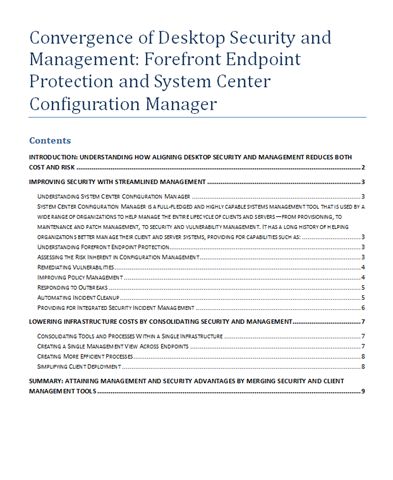 With Forefront Endpoint Protection (FEP) 2010, Microsoft has ended this siloed approach by building FEP into System Center Configuration Manager 2007 R2 and R3. For insight on the advantages of this merged approach, read the white paper Convergence of Desktop Security and Management: Forefront Endpoint Protection and System Center Configuration Manager. Also view the on-demand webcast Forefront Endpoint Protection 2010 and System Center Configuration Manager (Level 200).