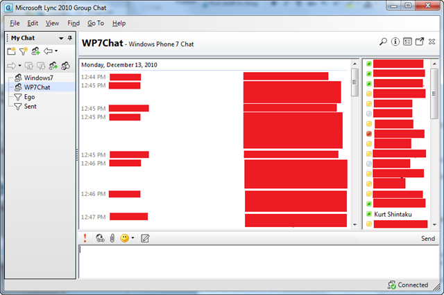 (The image to the right is my Lync 2010 Group Chat client… with all the names, messages, and membership redacted in RED. No, the client doesn’t normally have a ton of red bars in it!)