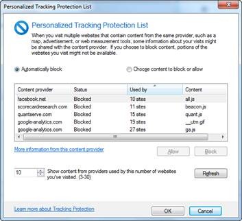 - OPTIONAL: If you click on the SETTINGS button, you’ll see what advertising/tracking domains IE9 is now blocking for you, many of which are responsible for the popup windows that appear when you go to many web sites.