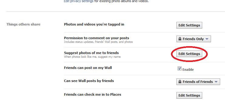 - Scroll down to “Things others share” and click on the “Edit Settings” button next to “Suggest photos of me to friends”.
