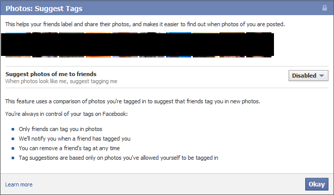 This is enabled by default and while I like Facebook as much as the next person I ain’t wild about this for variety of reasons. Carnegie Mellon University did a study that concluded that this kind of technology used with Facebook can potentially end anonymity altogether. Their comment about Facebook and privacy was telling: