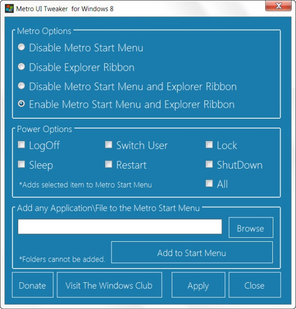 - Enable Metro Start Menu and Ribbon: Re-enables all available Metro UI options.