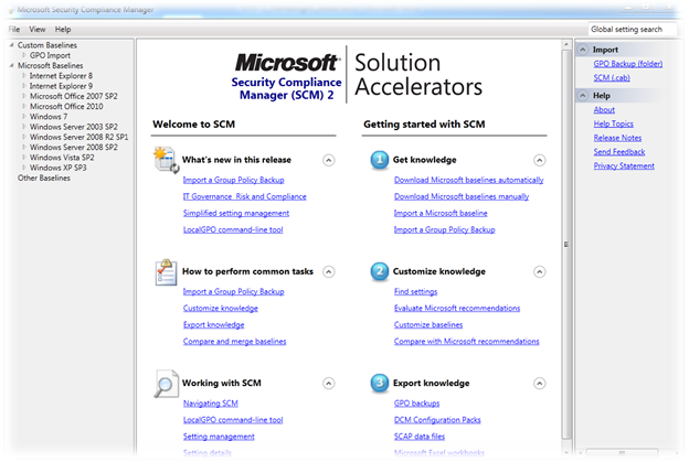 Security Compliance Manager 2 is a free tool from the Microsoft Solution Accelerators team that enables you to quickly configure and manage your computers, traditional datacenter, and private cloud using Group Policy and Microsoft® System Center Configuration Manager.