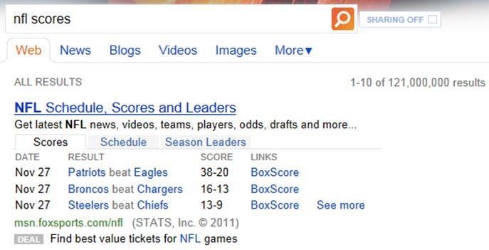 And what if you want scores fast? Search NFL Scores in the search box and get up-to-the-minute game day scores right at the top: