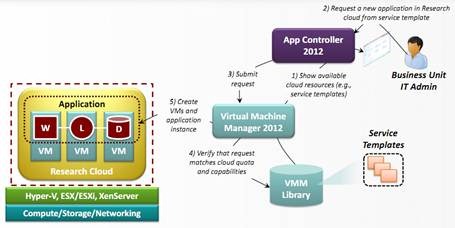 App Controller automates the provisioning of services in both the private cloud & public cloud. It rises to the “service level” instead of the “VM level” so in that sense it is sort of an evolutionary step beyond System Center Virtual Machine Manager (SCVMM) – although, it does automate SCVMM for the purposes of provisioning what’s necessary for the services requests by users.