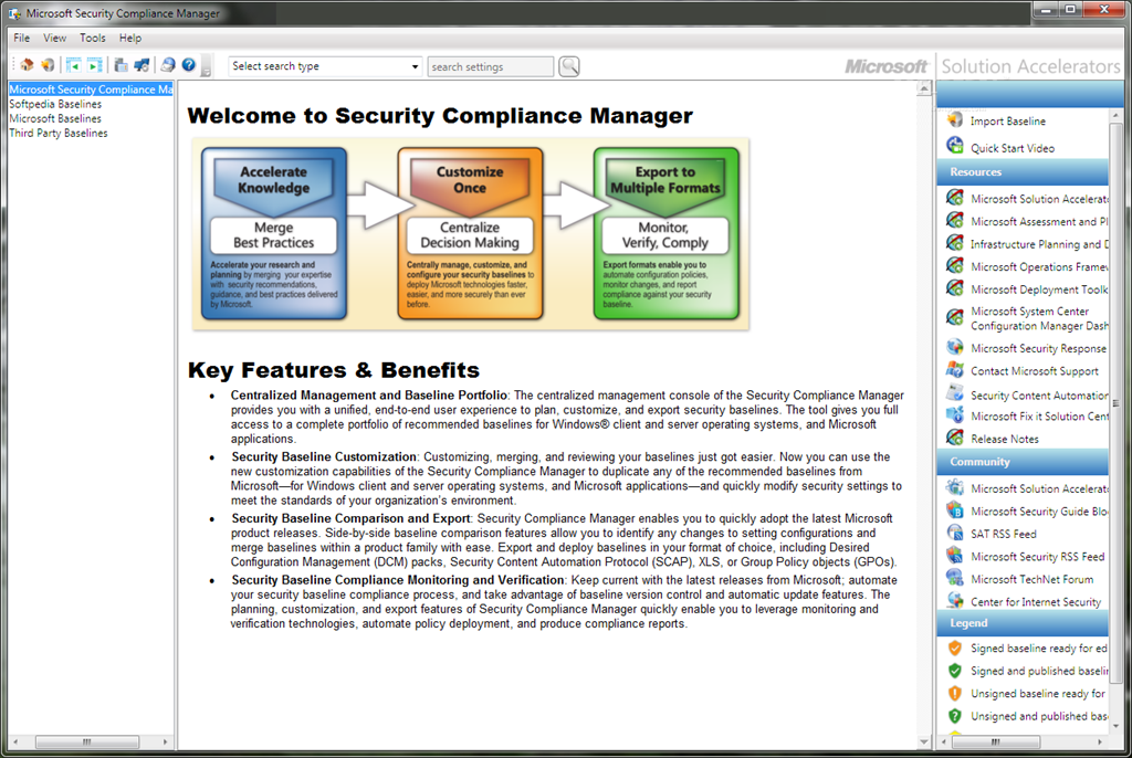 - Centralized Management of Your Baseline Portfolio: The centralized management console of the Security Compliance Manager provides you with a unified, end-to-end user experience to plan, customize, and export security baselines. The tool gives you full access to a complete portfolio of recommended baselines for Windows® client and server operating systems, and Microsoft applications. The Security Compliance Manager also enables you to quickly update the latest Microsoft baseline releases and take advantage of baseline version control.
