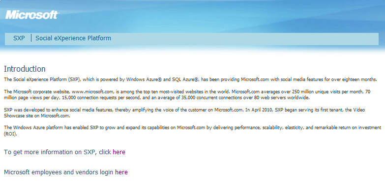 SXP was developed to enhance social media features, thereby amplifying the voice of the customer on Microsoft.com. In April 2010, SXP began serving its first tenant, the Video Showcase site on Microsoft.com.
