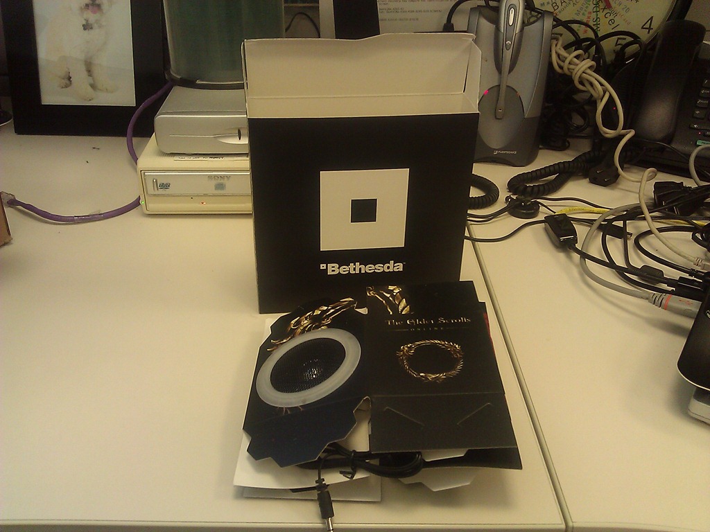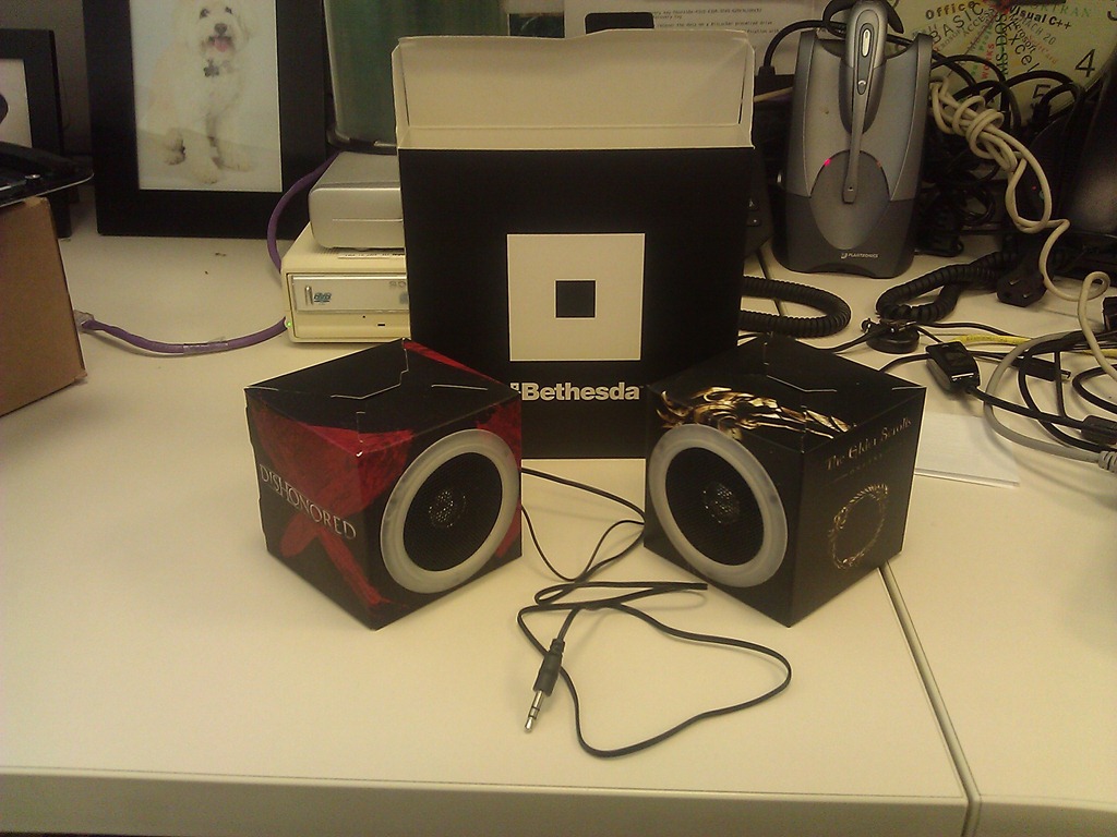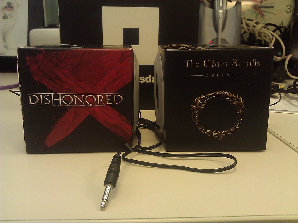 But this year, as I walked by a girl was stationed outside handing Bethesda boxes out. I had no idea what it was so I just took it. And lo and behold… they’re paper speakers for a PC! And they work – advertising Dishonored & the new Elder Scrolls Online.