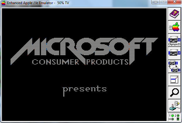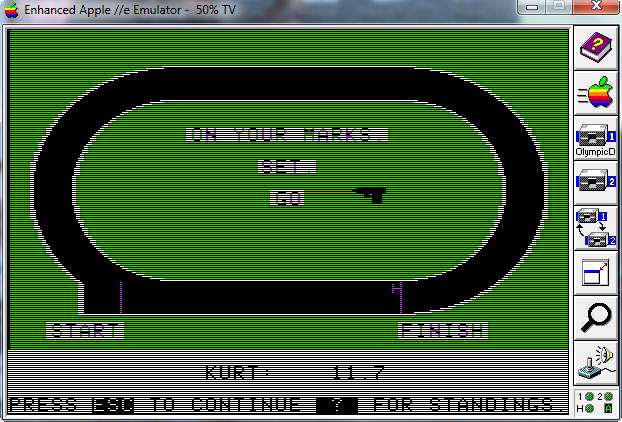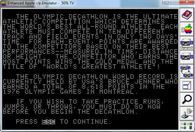 There it is: Our old logo. I played the game on my Windows 7 x64 machine after having not touched Olympic Decathlon for more than probably 30 years. And it plays like a champ in the AppleWin emulator. I highly recommend it!