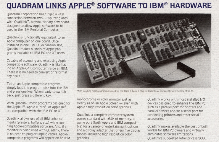 Back around 1984, I longed for something called the Quadram Quadlink, which was essentially an Apple II+ on a 16-bit ISA slot card for an IBM PC. You’d hit a ctrl-key and it’d literally BOOT an Apple computer on your IBM. It had the ROMs and all.
