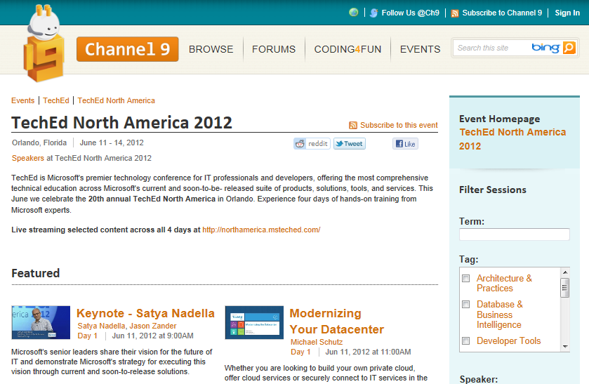 Tech Ed North America 2012 just took place in Orlando, Florida on June 11-14th and you can view all 427 Tech Ed North America sessions now! They are published on Channel 9 under the events section. We also have all Channel 9 Live sessions up and on demand.