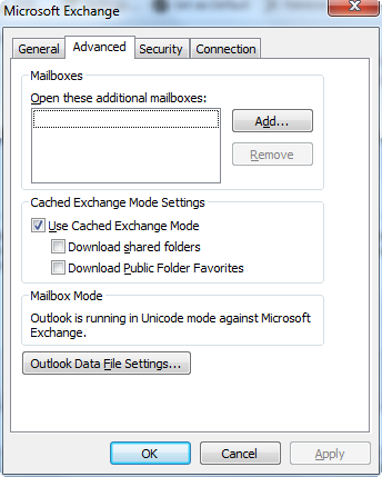 - Click the “Advanced” tab. You will see a checkbox group called “Cached Exchange Mode Settings”.