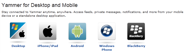There’s Yammer clients available for Windows Desktop, iPhone/iPad, Android, Windows Phone, & Blackberry.