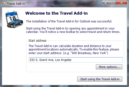 When pressing the Directions button, the add-in uses your predefined address and the location field of the appointment or meeting to get the directions. The nice thing of this add-in is that this is being done directly in the appointment or meeting window and does not launch an external browser. This mapping is being done via Bing Maps.