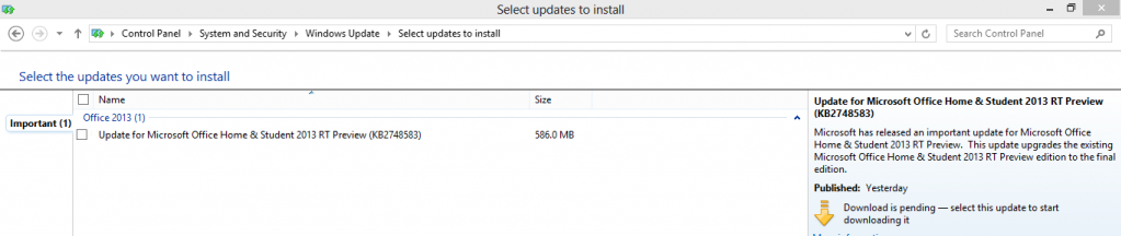 - Check the box next to “Update for Microsoft Office Home & Student 2013 Preview”