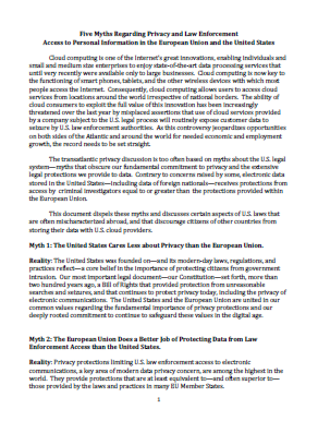 The ability of cloud consumers to exploit the full value of cloud innovation has been increasingly threatened over the last year by misplaced assertions that use of cloud services provided by a company subject to the U.S. legal process will routinely expose customer data to seizure by U.S. law enforcement authorities. As this controversy jeopardizes opportunities on both sides of the Atlantic and around the world for needed economic and employment growth, the record needs to be set straight.