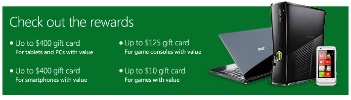 *Valid March 4, 2013 until March 31, 2013. Available in select Microsoft retail stores in US (not including Puerto Rico); not valid Microsoft online store. To be eligible for trade-in, your tablet, PC, phone, game console, or game media, should include device power cord, if available, and device cannot be password protected. Applicable Microsoft store gift-card value will be determined at trade-in, and is subject to Microsoft’s discretion and manager approval. Not valid on prior orders or purchases; cannot be transferred or otherwise redeemed for cash or gift cards. Not combinable with other offers. All trade-ins are final. Other Recycle for Rewards terms and conditions apply. See store associate for details.