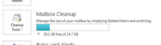 This just blows me away. I have 20.2GB of free mailbox storage remaining… and forget “web-based email”: I still have have all the client/server speed, richness, & offline capabilities of Outlook 2013 & Exchange Server 2013. (Yeah sure, I have OWA HTML mail which is excellent… but when I really wanna do some real work, I use a mail client & I bet you do too)