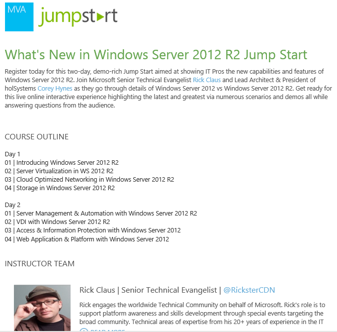 Join this live multi-day MVA Jumpstart online event with Microsoft Senior Technical Evangelist Rick Claus and Cory Hynes from HOL Systems to learn about the new capabilities and features coming in Windows Server 2012 R2. Sign up today.