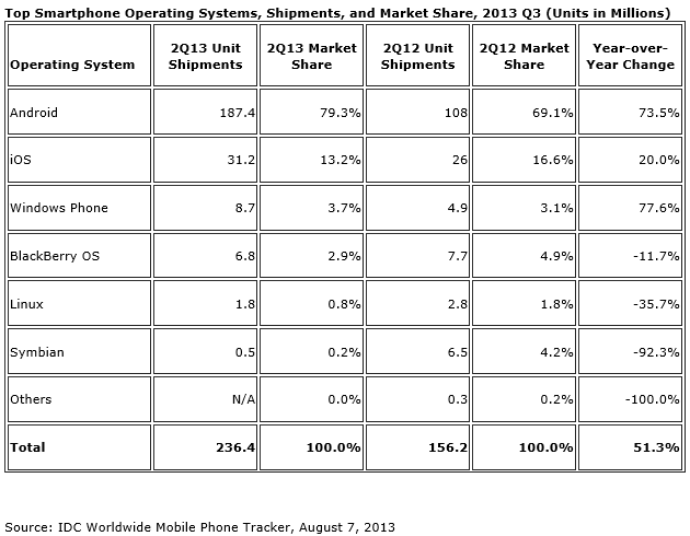 FRAMINGHAM, Mass. August 7, 2013 – Despite beating Wall Street expectations in terms of shipment volumes, Apple’s share in the worldwide smartphone operating system market posted a year-over-year decline during the second quarter of 2013 (2Q13). Meanwhile, Android and Windows Phone both managed slight increases during the same period. According to the International Data Corporation (IDC) Worldwide Quarterly Mobile Phone Tracker, vendors shipped a total of 236.4 million smartphones in 2Q13, up 51.3% from the 156.2 million units shipped in 2Q12. Second quarter shipments grew 9.3% when compared to the 216.3 million units shipped in 1Q13.