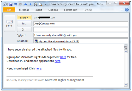 RMS enables organizations to share sensitive documents within their organization or to other organizations with unprecedented ease. These documents can be of any type, and you can consume them on any device. Given the protection scheme is very robust, the file can even be openly shared… even on consumer services like SkyDrive™/DropBox™/GDrive™.