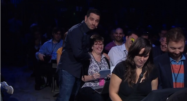 That’s Microsoft Corporate VP of Windows Devices, Panos Panay, hugging ZDnet blogger & Microsoft reporter, Mary Jo Foley, who is mentioned immediately before Panos refers to a funny hypothetical situation involving the media. (And if you look carefully, you can see Windows expert & all-around-curmudgeon Paul Thurrott to the right, facing her and laughing as she holds Panos’ locked down Surface 2 which contains the Surface product roadmap for the next 3 years)