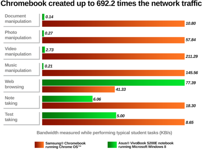 A recent study demonstrates that Chromebooks can generate nearly seven hundred times more web traffic than a Windows 8 laptop. Large deployments of Chromebooks may require investments in network infrastructure that could negate any perceived savings.
