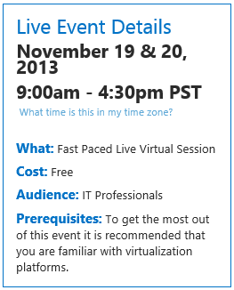 You can get a free voucher for the new Microsoft Virtualization Certification exam by attending our live Server Virtualization Jump Start going on November 19 & 20, 2013 from 9:00am – 4:30pm PST.