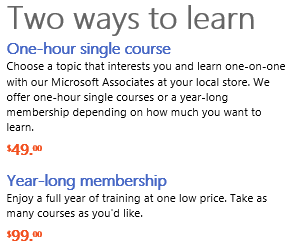 If you have friend, relatives, or customers that need basic “how to” end-user training, would like PERSONAL attention, & they happen to live near a Microsoft Store, this offer is absolutely unbeatable. Folks can get trained on any of the following topics each week: