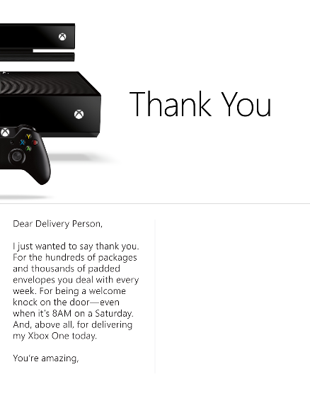 I just wanted to say thank you. For the hundreds of packages and thousands of padded envelopes you deal with every week. For being a welcome knock on the door – even when it’s 8AM on a Saturday. And, above all, for delivering my Xbox One today.