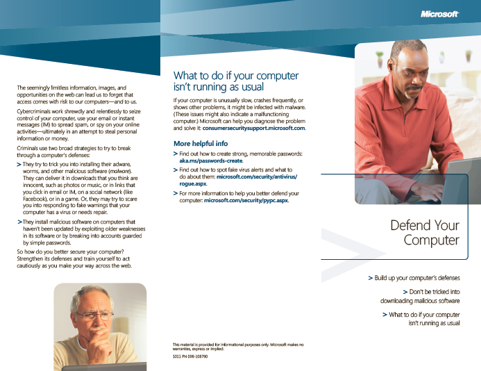 These resources – brochures, flyers, videos, and posters — provide an insight into how employees can protect their devices and documents. Also included is a quiz for testing a person’s internet security understanding, a white paper on Consumerization of IT@Microsoft, a list of helpful web sites and additional resources, and several educational videos that are ideal for team and company meetings.